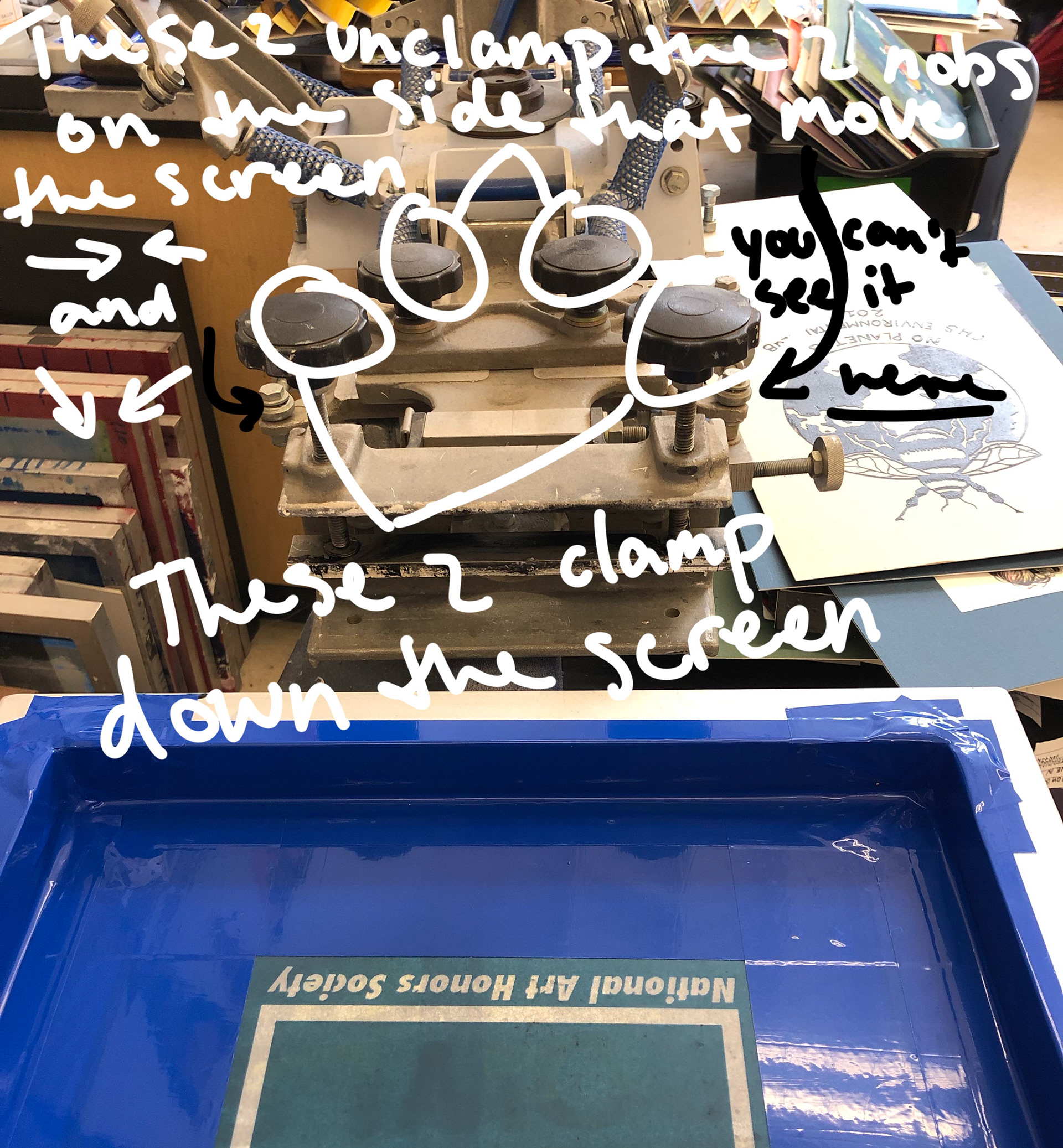If the dryer breaks then you can use a heat gun, but that really sucks, or you can use the mobile dryer thing but I don’t know how to use it. You can also, instead of using the machine, put cardboard in the shirt (I did this on bags) and have someone hold the screen down while you push the ink through.