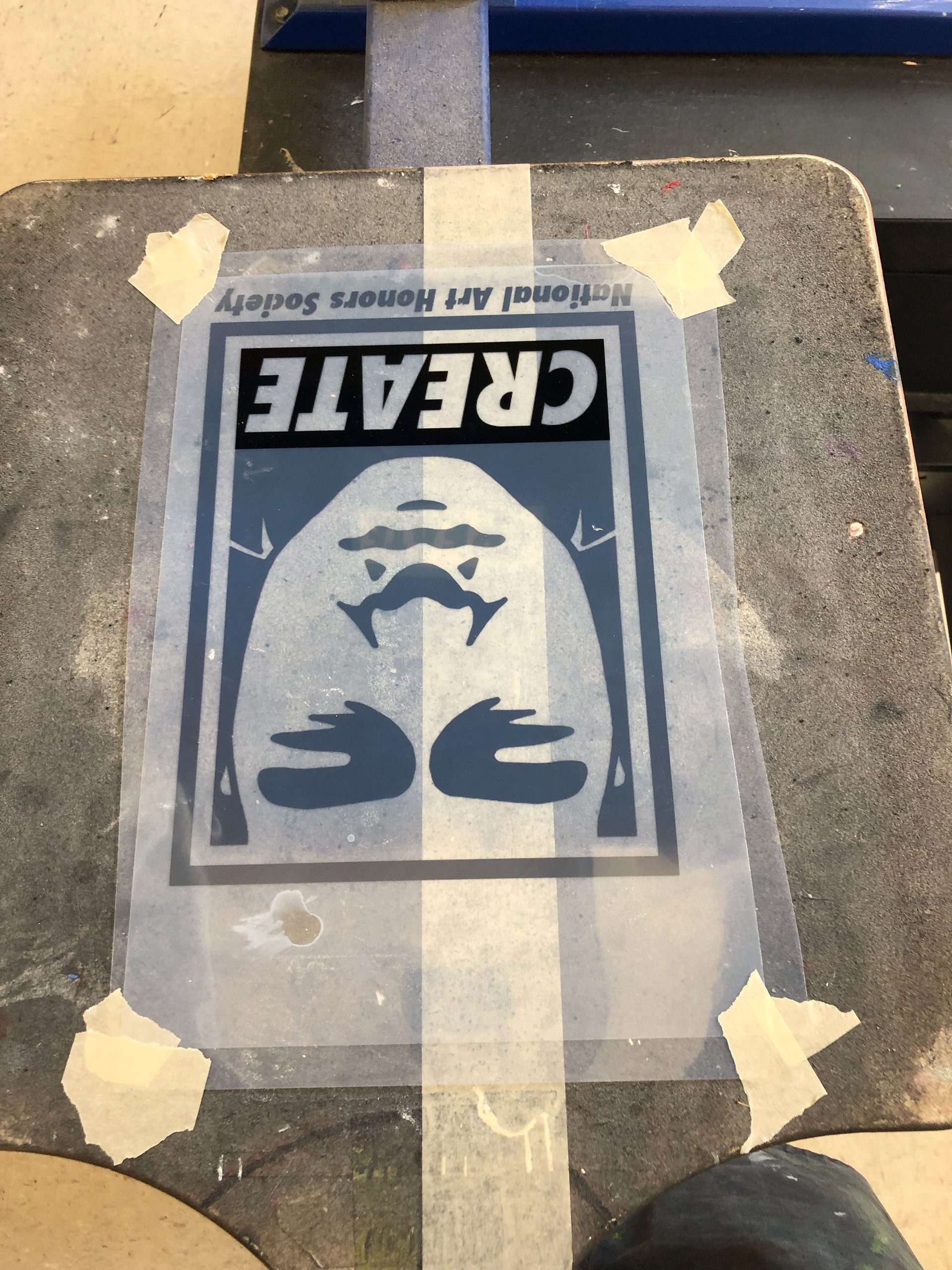 Cleaning is very important but, not going to lie, it sucks. First take the tape off and then wipe off as much of the ink as you can with paper towels making sure you be careful you don’t get it all over what is under the screen. I suggest you wear gloves because it will stain your hands. Before you spray the ink with the ink cleaner you have to remove the emulsion because the chemical that is used to get rid of the ink actually seals the emulsion onto the screen (this can be helpful sometimes though). Use the “engine cleaner” on the bottom of the screen with a sponge to remove it. The longer the emulsion has been on the screen, the harder it is to get off. Once the emulsion is gone you can use the screen opener to get the remaining ink off. Go outside for this and consider wearing a mask, because this stuff is gnarly. Then you should have a clean screen ready for reuse.